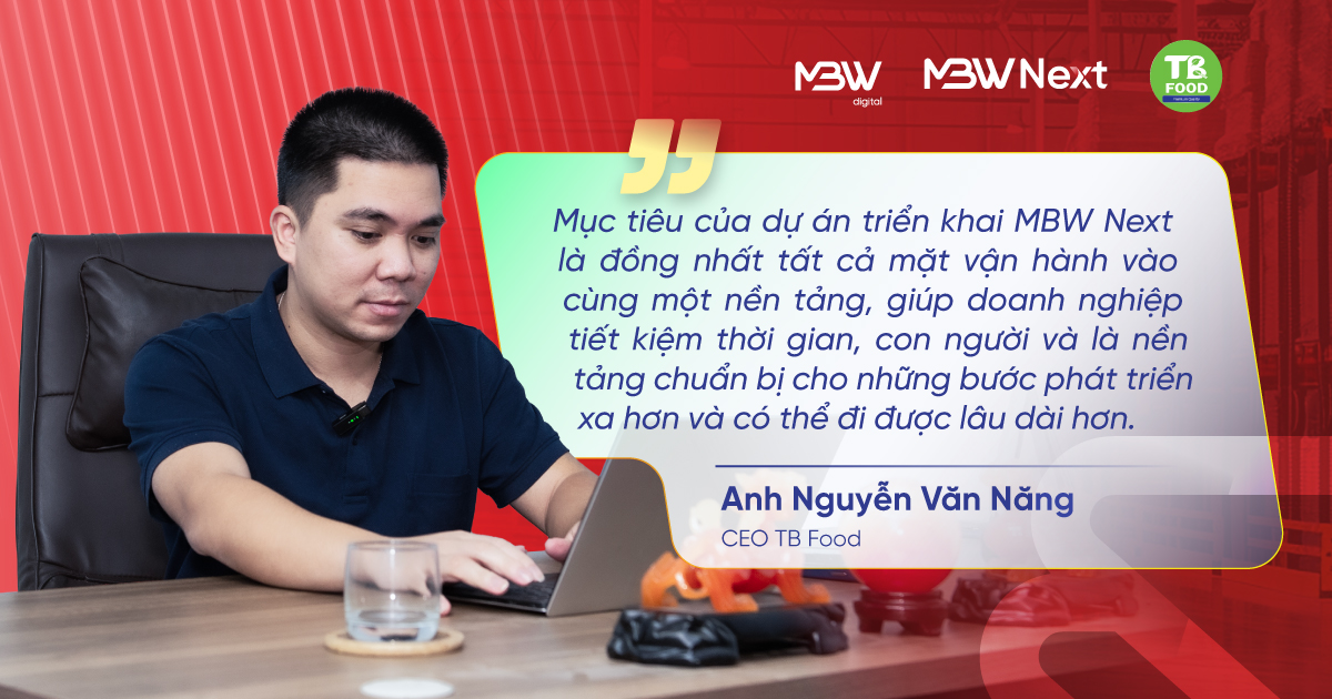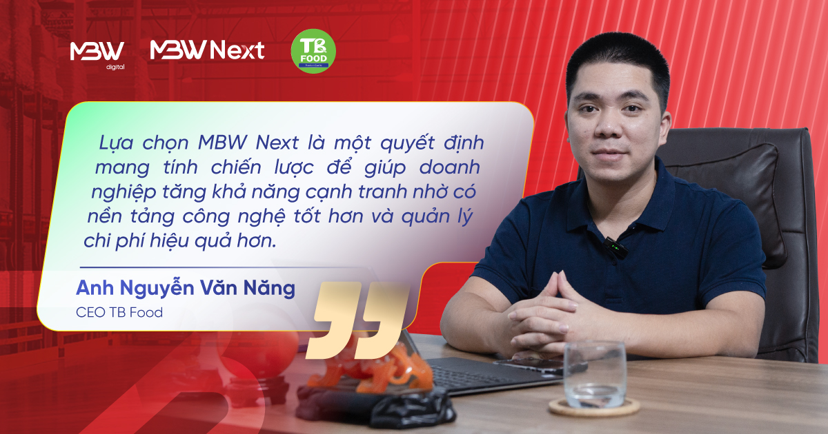 “Chúng tôi cần một nền tảng đồng nhất để chuyên nghiệp hóa hệ thống và chuẩn bị cơ sở hạ tầng cho những bước phát triển xa hơn. Lựa chọn MBW Next là quyết định mang tính chiến lược để tăng năng lực nội tại và khả năng cạnh tranh trên thị trường.” – Anh Nguyễn Văn Năng – CEO TB Food.